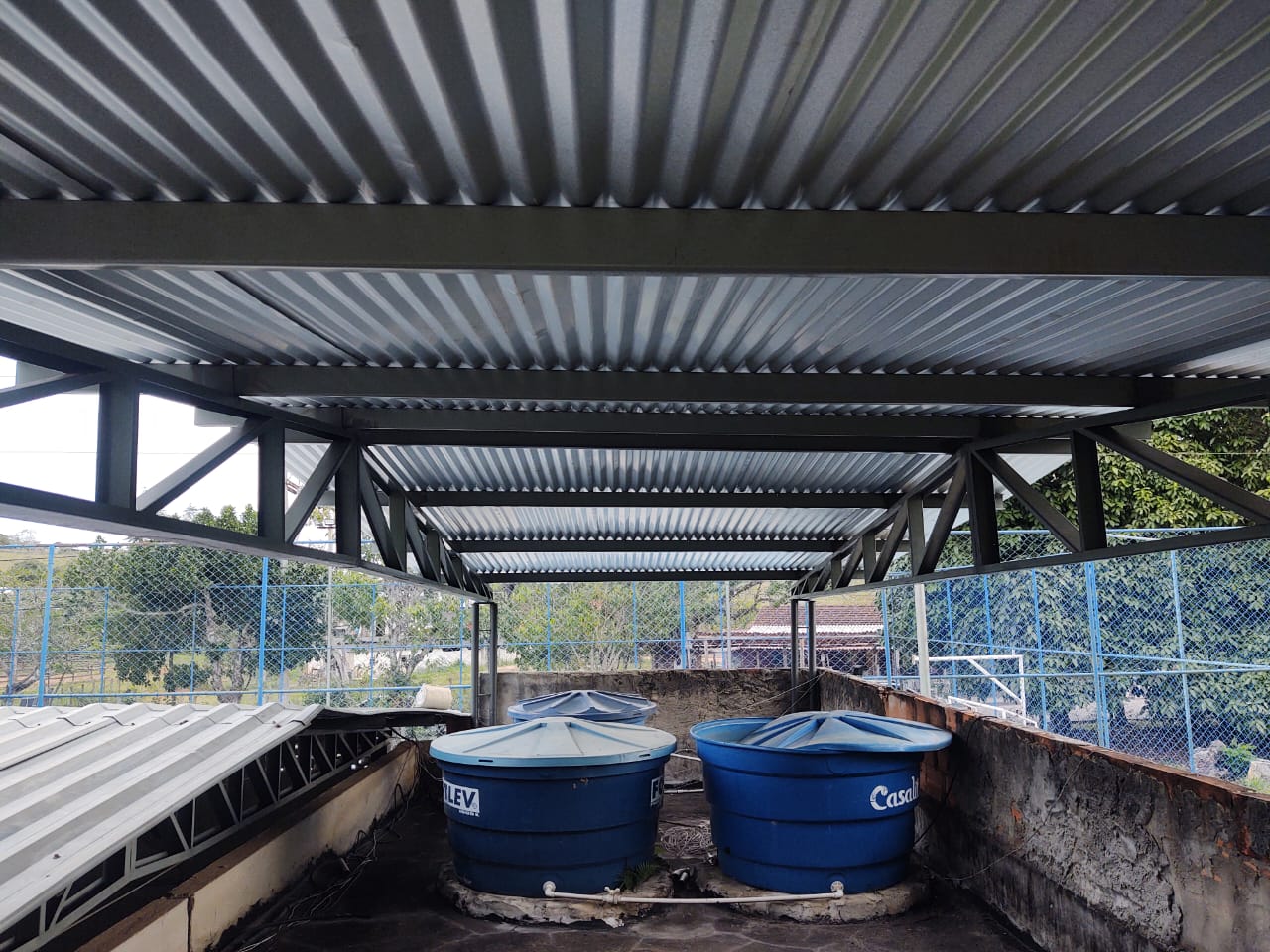 Construção do telhado do Salão de Festas, além de proporcionar mais um espaço para os painéis solares.